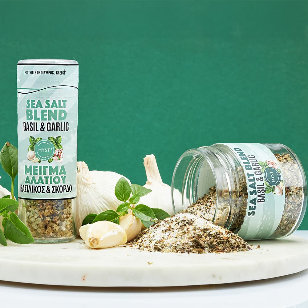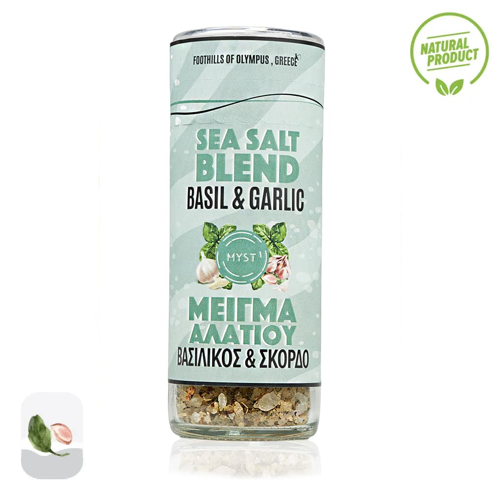 Pure sea salt from the foot of Olympus and aromatic basil combined with dried garlic. A salt with a pleasantly rich aroma of basil, combined with a light note of characteristic garlic flavour.